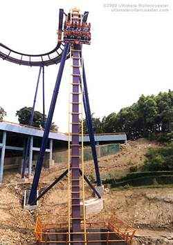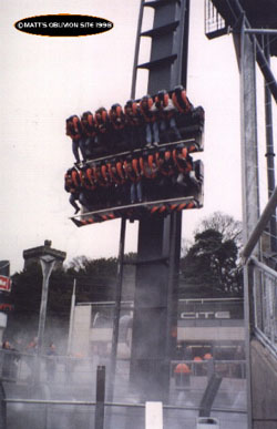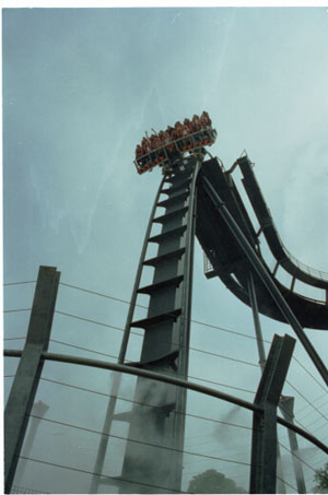 To dive = plonger. Jusque la tout est normal mais la plongeon dont on parle ici se fait verticalement !!! En effet les "Diving Machine" ont pour particularité de faire littéralement "tomber" les trains le long de la voie dans un trou bien obscur !! En fait, cette chute "verticale" n'est "que" de 87.5°. L'autre particularités de ces machines est d'avoir des trains dont les wagons peuvent accueillir 8 passagers assis cote a cote. Les trains ne comportent que deux de ces wagons de façon a ce que le dernier du train ne plonge pas trop rapidement dans la chute verticale. Actuellement il n'en existe que deux au monde, exclusivement construit par B&M